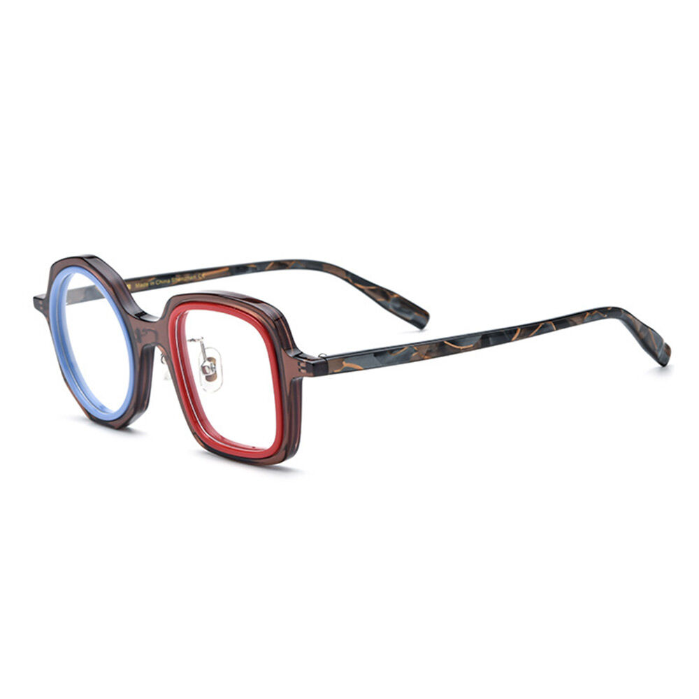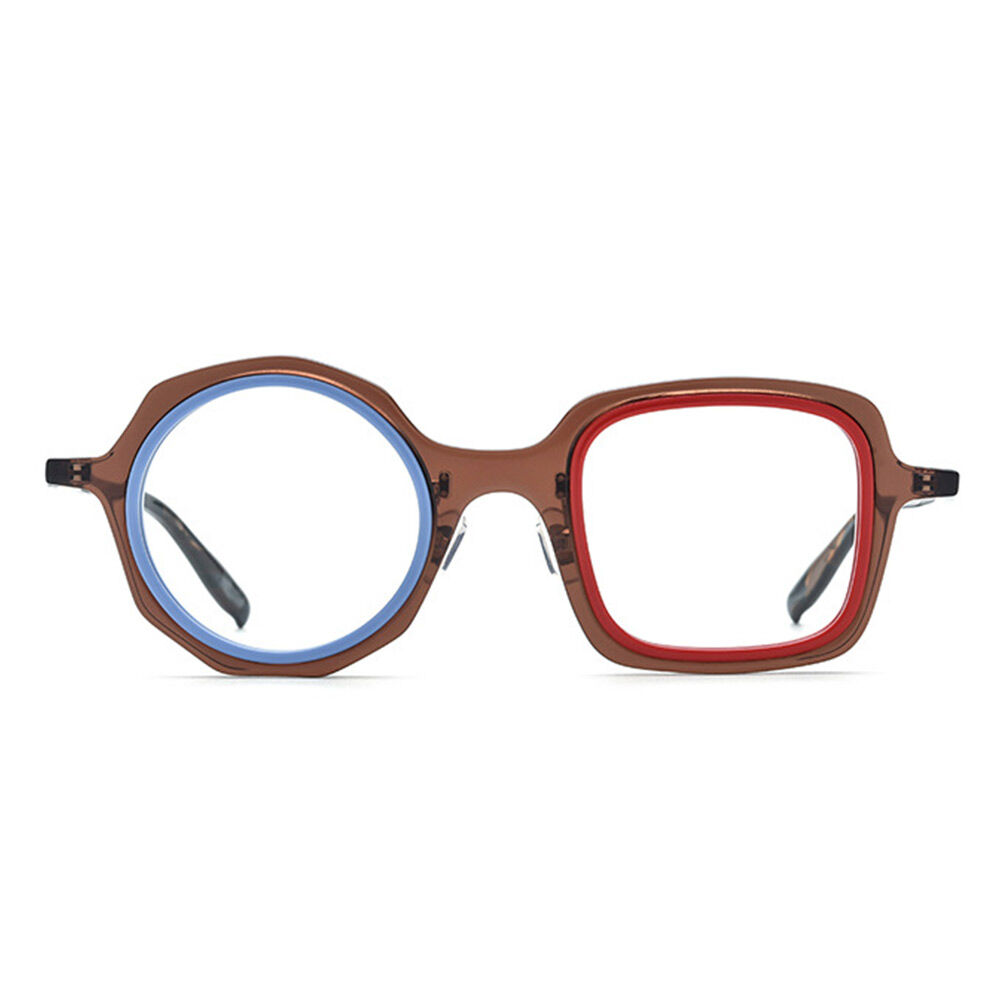 Asymmetrical frame glasses with vibrant colors exude a unique and bold personality. These eyeglasses feature frames that are intentionally designed with uneven or asymmetric elements, adding a touch of creativity and individuality to the wearer's look. The asymmetrical design creates a dynamic and eye-catching aesthetic that sets these glasses apart from traditional styles.